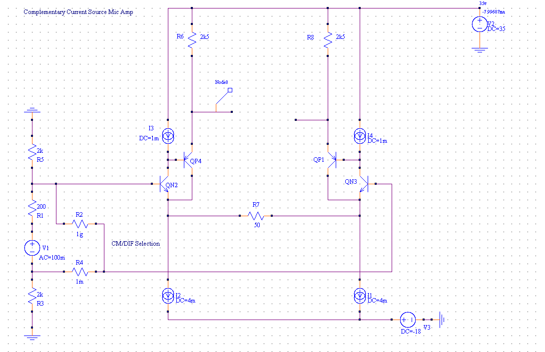 The SuperSpice example for this is ComplementaryCurrentSourcedCascodeMicAmp.sss