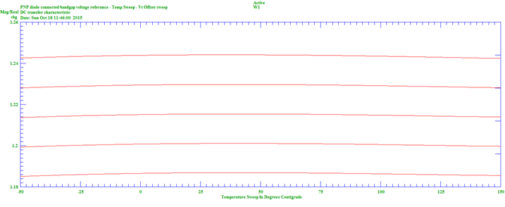 Variation of Vt for MN2 shows the temperature set point is independent of Vt offset variations and that the “magic” bandgap voltage moves by around 7.2 mv/1 mv of Vt voffset.