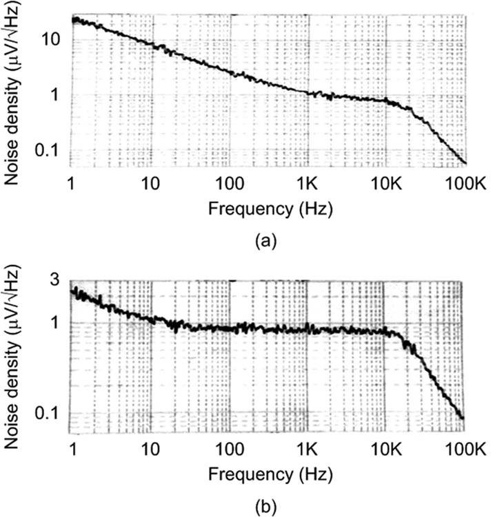 Nominal flat band noise is 160 nV/sqrthz. 10 Hz noise is 1 uV, 1 Hz noise is 3 uV